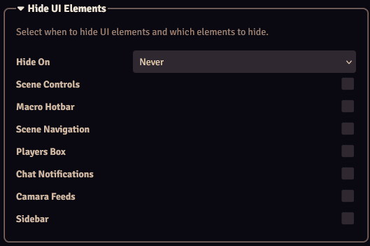 With the Hide UI Elements settings you can configure specific Foundry elements to be hidden.