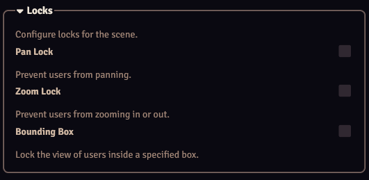 | Owned Tokens | View is forced to this bounding box if the player owns a token within this bounding box, otherwise the scene dimensions will be the bounding box. |