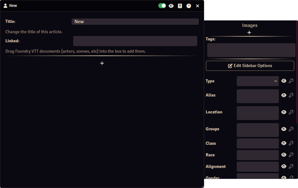 - Go back to Play mode and notice that these options appear in the sidebar. Only filled in options will appear. You can optionally choose to hide options from all players by pressing the icon, or make an option secret (hide it for players that do not have the right ownership level to see secrets) by pressing the icon.