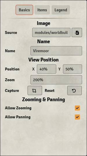 Position | Sets the view of the map when the widget/article is opened. Can be given in pixels (by entering a number), or as a percentage of the map's width or height: X: 0% means the left edge of the map is displayed in the center.X: 50% means the center of the map is displayed in the center.X: 100% means the right edge of the map is displayed in the center. |