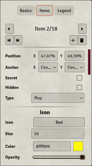 Icon | Select the icon for the map item. Clicking on the button will open a drop-down menu where you can select the icon.Select File will allow you to choose an image file instead of one of the supplied icons.The icon can be further configured below. |